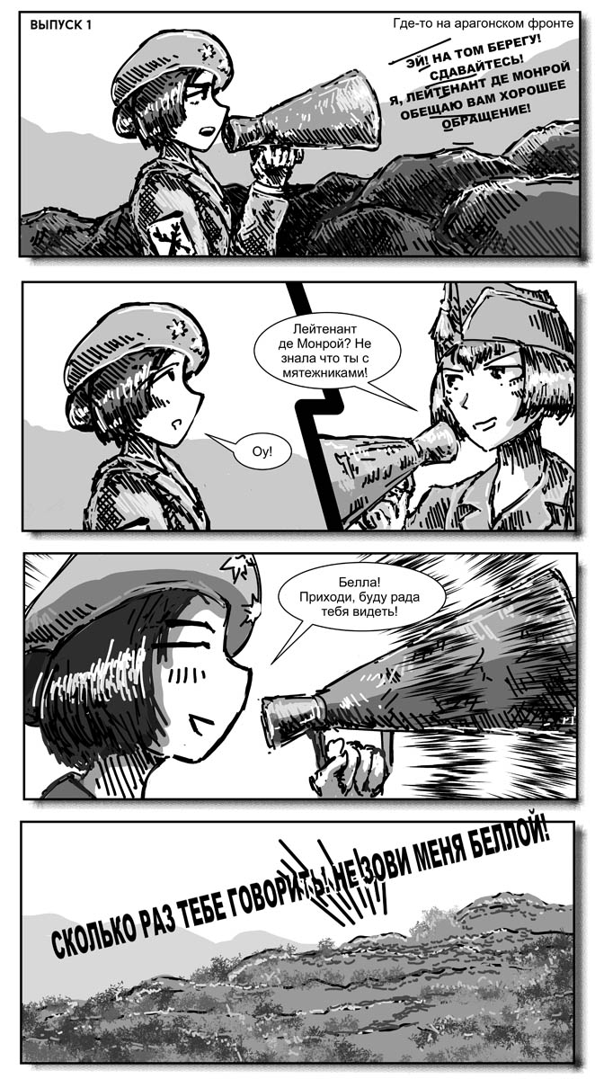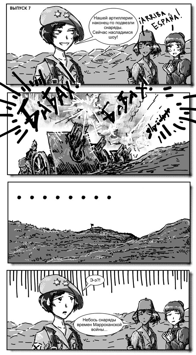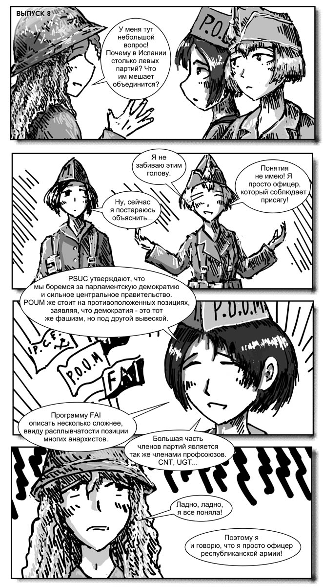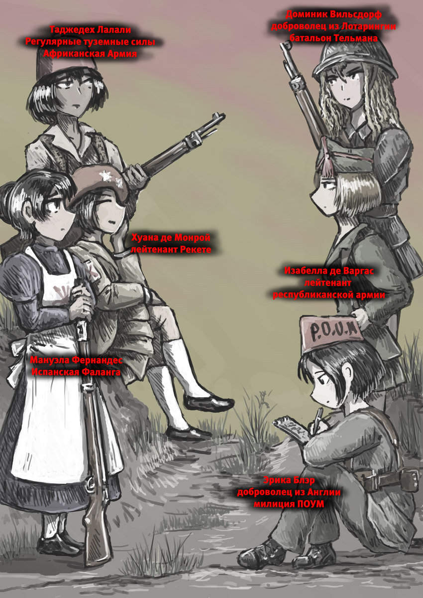 Правда без пары изменений не обошлось. Маки-тян как-то неисторично было оставаться воином-ягуаром, поэтому она стала членом Марокканского корпуса. Ну и я ввел нового персонажа - Эрику Блэр, просто потому, что блин половину материала я попячил из "Памяти Каталонии" Оруэлла.