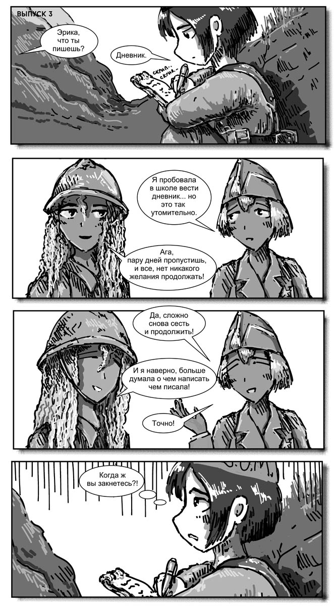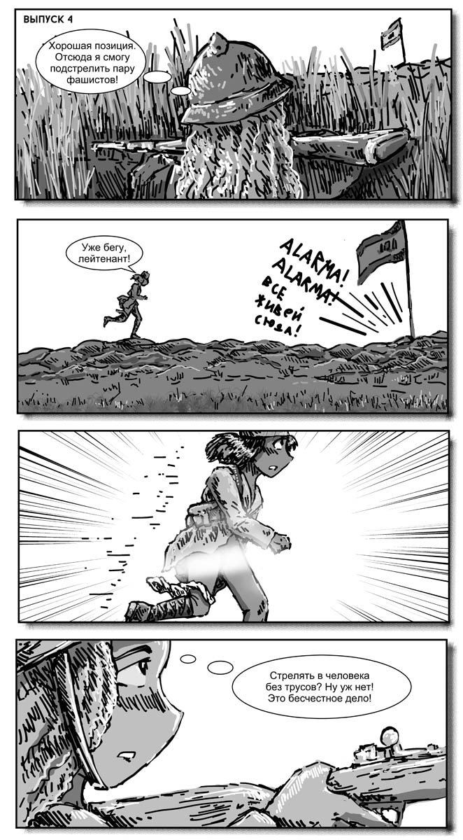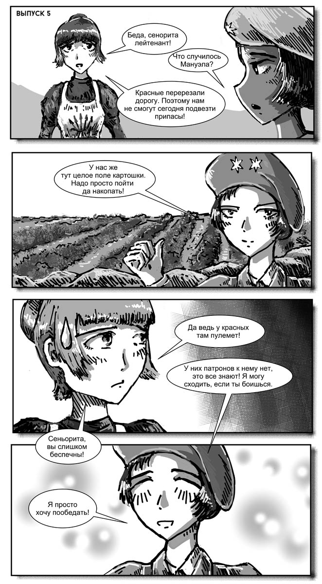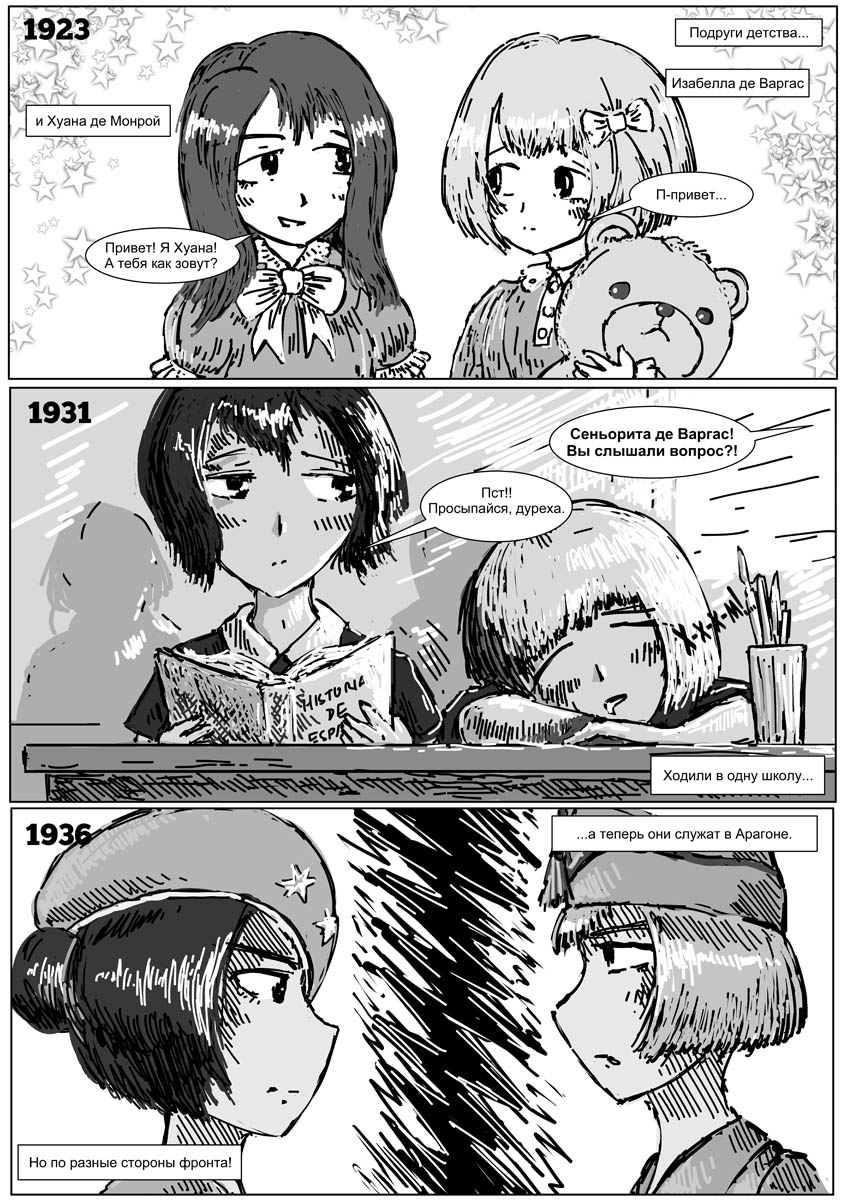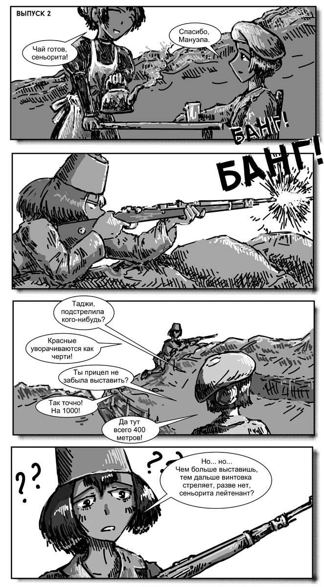 Правда без пары изменений не обошлось. Маки-тян как-то неисторично было оставаться воином-ягуаром, поэтому она стала членом Марокканского корпуса. Ну и я ввел нового персонажа - Эрику Блэр, просто потому, что блин половину материала я попячил из "Памяти Каталонии" Оруэлла.